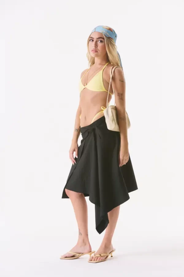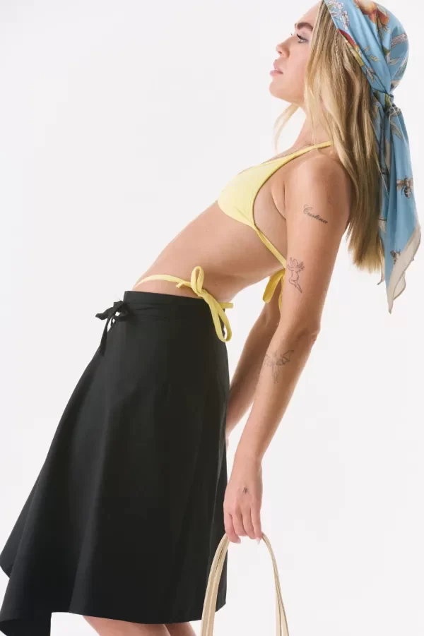 Confeccionada en lycra pesada de colores lisos. El top es un triangulito con tiras corredizas para ajustar y atar en cuello y espalda. La bombi es estilo colaless para atar a los costados. Detalle de avío metálico