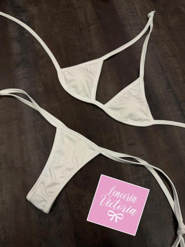 Confeccionada en lycra pesada de colores lisos. El top es un triangulito con tiras corredizas para ajustar y atar en cuello y espalda. La bombi es estilo colaless para atar a los costados. Detalle de avío metálico