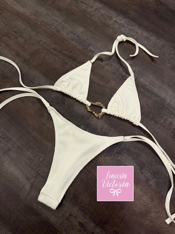 Confeccionada en lycra pesada de colores lisos. El top es un triangulito con tiras corredizas para ajustar y atar en cuello y espalda. La bombi es estilo colaless para atar a los costados. Detalle de avío metálico