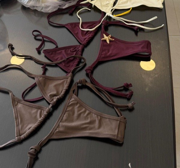 Confeccionada en lycra pesada de colores lisos. El top es un triangulito con tiras corredizas para ajustar y atar en cuello y espalda. La bombi es estilo colaless para atar a los costados. Nuestras bikinis tienen cambio