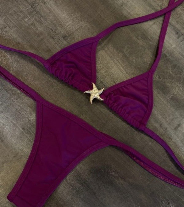Confeccionada en lycra pesada de colores lisos. El top es un triangulito corredizo, realizado con un avío metálico en forma de ESTRELLA. La bombi es estilo colales de laterales finos y para atar.