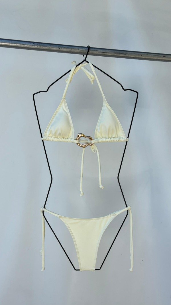 Confeccionada en lycra pesada de colores lisos. El top es un triangulito con tiras corredizas para ajustar y atar en cuello y espalda. La bombi es estilo colaless para atar a los costados. Detalle de avío metálico