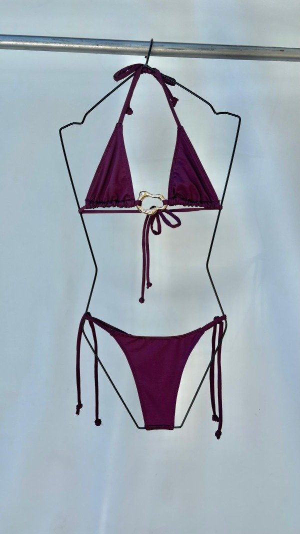 Confeccionada en lycra pesada de colores lisos. El top es un triangulito con tiras corredizas para ajustar y atar en cuello y espalda. La bombi es estilo colaless para atar a los costados. Detalle de avío metálico
