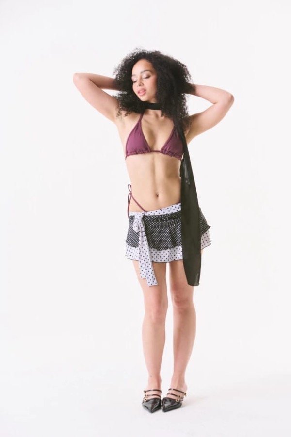 Confeccionada en lycra pesada de colores lisos. El top es un triangulito con tiras corredizas para ajustar y atar en cuello y espalda. La bombi es estilo colaless para atar a los costados. Nuestras bikinis tienen cambio